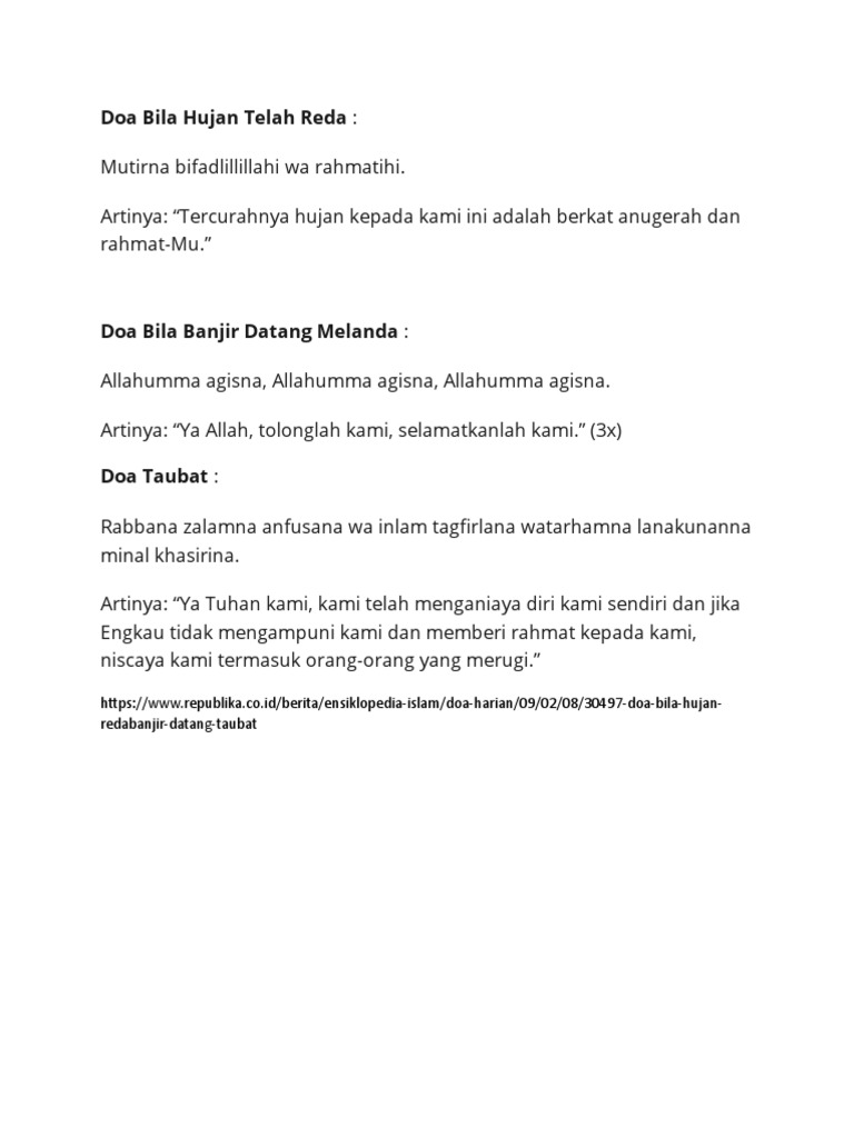 Oleh sebab itu islam melarang untuk menghujat hujan menyesali ataupun memakinya. Doa agar hujan berhenti atau reda cukup mudah dilafalkan. Demikianlah teks bacaan doa ketika turun hujan dan doa setelah hujan berhenti reda lengkap bahasa arab latin dan artinya.